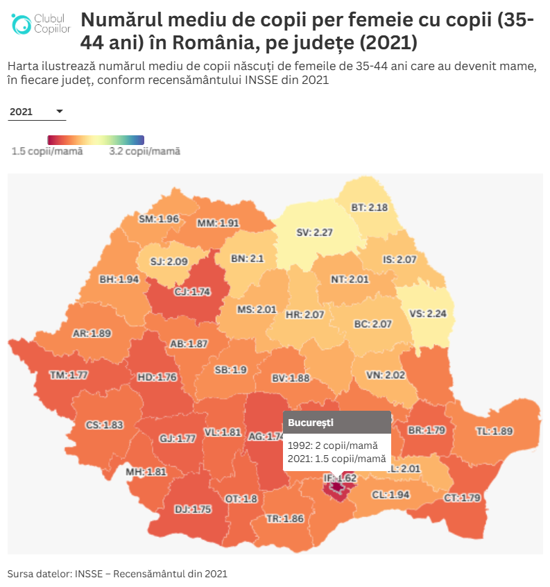 Dacă media națională a femeilor cu vârsta între 35 și 44 de ani fără copii este de 19%, acest procent poate varia semnificativ de la un județ la altul. Așa cum am observat în studiul nostru, atât mediul urban, cât și cel rural urmează aceeași tendință, iar nivelul de educație are un impact similar: femeile educate din mediul urban cu vârsta între 35 și 44 de ani sunt, într-un procent mai mic, mame, comparativ cu cele din mediul rural sau cu cele care au un nivel de educație mai scăzut.