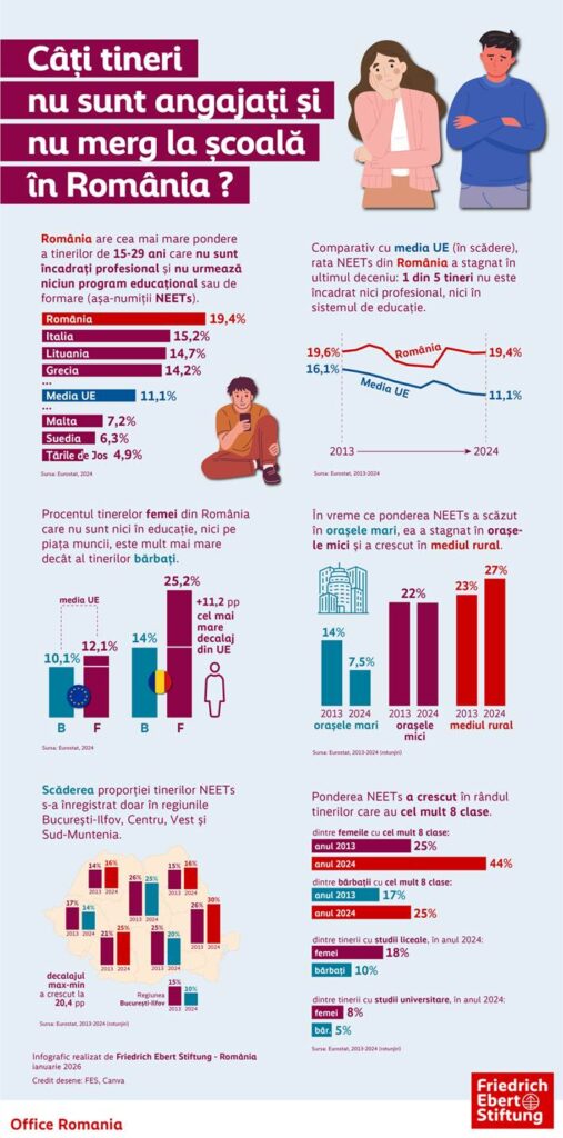 România continuă să aibă cea mai mare proporție din Uniunea Europeană în privința tinerilor cu vârsta între 15 și 29 de ani care nu sunt încadrați profesional și nu urmează niciun program educațional sau de formare (NEETs): 19,4% din totalul populației din grupa respectivă de vârstă, în anul 2024, conform datelor Eurostat prelucrate de Monitorul Social, proiect al Friedrich-Ebert-Stiftung România.
