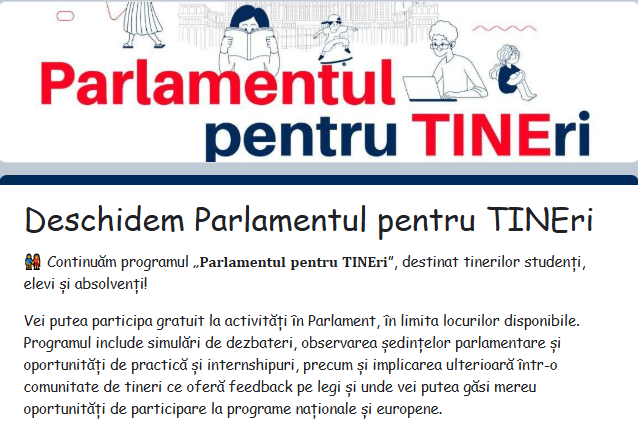 Programul Parlamentul pentru TINEri, inițiat de deputata Oana Țoiu, deschide ușile Parlamentului și în 2025, invitând studenți, tineri absolvenți și elevi să fie deputați timp de o zi în Casa Poporului, pe 25 martie, 3 aprilie, 22 mai și 26 iunie.